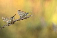 Twee zwartsprietdikkopjes op een grasaar in het vroege ochtendlicht. Er zijn nog wat kleine dauwdruppels zichtbaar.