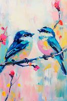 Twee speelse vogels zitten op een delicate tak, omringd door bloemen in zachte pasteltinten. Hun heldere blauwe en gele verenkleed straalt levensvreugde uit, terwijl zachte bloesems het beeld tot leven brengen. Een harmonieuze symbiose van kleuren en vormen legt het magische moment van samenzijn perfect vast.