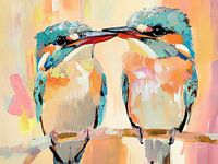 Twee vogels - Op dit schilderij zie je twee kleurrijke vogels dicht bij elkaar met een zachte achtergrond van pastelkleuren, wat dit een vrolijk en sfeervol kunstwerk maakt.