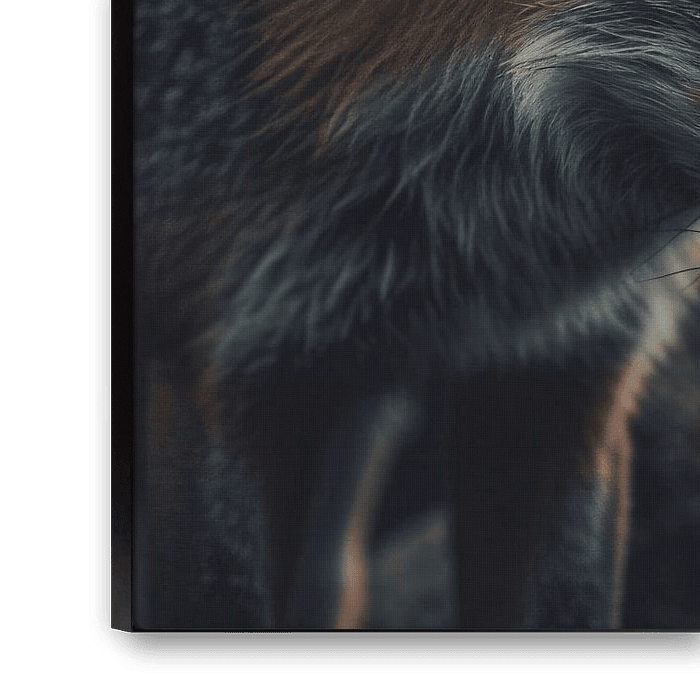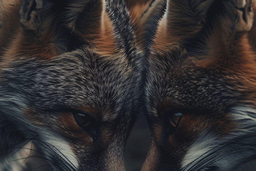 Dit prachtige ontwerp toont twee vossen die elkaar recht aankijken in een donkere, mysterieuze omgeving. De aandacht voor detail in hun vacht en gezichtsuitdrukkingen is indrukwekkend en brengt de dieren echt tot leven. De kleuren zijn subtiel, voornamelijk bestaande uit verschillende tinten bruin, zwart en oranje, wat een prachtig contrast creëert tegen de donkere achtergrond. Dit kunstwerk straalt een gevoel van intimiteit en verbondenheid uit, perfect voor elke natuurliefhebber. Hang het in je kantoor of slaapkamer voor een vleugje wilde elegantie en een constante herinnering aan de schoonheid van de natuur.