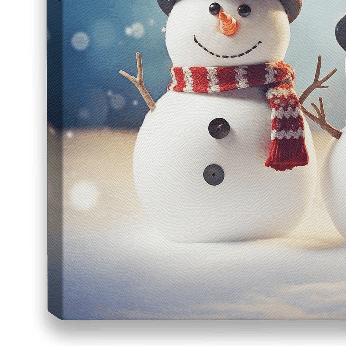 Afbeelding van twee vrolijk kijkende sneeuwpoppen in de sneeuw. Ze dragen een wit met rode muts en sjaal.