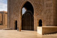 Twee vrouwen op weg naar het gebed in de Hassan II-moskee in Casablanca, wat recht doet aan de grootte van de poort waar ze doorheen gaan.