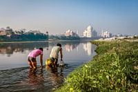 Twee waterdragers in de Yamuna rivier bij de Taj Mahal in Agra India. Wout Kok One2expose