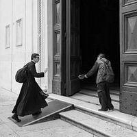 Deze scène gaat over onuitgesproken contrasten - tussen privileges en behoeftes, traditie en realiteit. De compositie trekt je mee in de interactie vlak voordat deze plaatsvindt: een priester die op het punt staat de kerk binnen te gaan en een man buiten met uitgestoken hand. Er zit spanning in de ruimte tussen hen in, in de open deur die de innerlijke rust scheidt van de ontberingen op straatniveau.