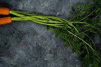 Twee oranje worteltjes, bospeen, met groen loof in elkaar gestrengeld op een donkergrijze achtergrond.