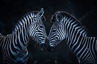 Deze indrukwekkende afbeelding toont twee zebra’s die elkaar in een donkere omgeving begroeten. Het contrast tussen de zwart-witte strepen van de zebra’s en de donkere achtergrond zorgt voor een krachtige en intrigerende uitstraling. Deze foto is perfect voor liefhebbers van natuur en wildlife en voegt een vleugje elegantie en mysterie toe aan elke ruimte. Ideaal voor een kantoor of slaapkamer, waar het kan dienen als een gespreksonderwerp of een bron van inspiratie. De hoge kwaliteit en het scherpe detail maken deze afbeelding een opvallend kunstwerk dat zeker indruk zal maken.