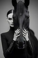 Een contrastrijk zwart-wit portret toont een elegante vrouw in minimalistische, donkerkleurige kleding die zich dicht tegen het hoofd van een paard nestelt. Haar handen, versierd met opvallende sieraden en lange nagels, omhelzen zachtjes het gezicht van het paard. Mens en dier smelten visueel samen tot een symmetrische, iconische…