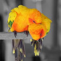 De foto is digitaal nabewerkt. De achtergrond is zwart wit gemaakt zodat de kleuren van de vogels nog meer gaan spreken.