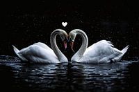 Deze prachtige afbeelding toont twee zwanen die hun nekken naar elkaar buigen, waardoor er een hartvorm ontstaat. De achtergrond is donker, wat de witte veren van de zwanen nog meer doet opvallen. Dit beeld straalt sereniteit en liefde uit, perfect voor een slaapkamer of kantoor om een gevoel van rust en romantiek te brengen. Het spel van licht en schaduw in het water voegt een extra dimensie toe aan de foto. Deze afbeelding is een elegante toevoeging aan elk interieur, vooral voor diegenen die houden van klassieke schoonheid en natuurbeelden.