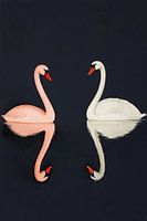 Dit kunstwerk heeft een elegant en minimalistisch ontwerp dat perfect zou passen in een modern boho of Scandinavisch interieur. We zien een roze en witte zwaan tegen een donkere achtergrond. De reflectie van de zwanen is te zien in het water.