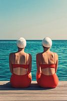 Twee silhouetten in felrood zitten ontspannen op de oever, hun kalmte in harmonie met het glinsterende blauw van het water. De stijlvolle badmutsen geven het moment een nostalgische charme en doen denken aan vervlogen zomerdagen. De zachte gloed van het licht omhult hen terwijl de golven zachtjes kabbelen en de wereld om hen heen in…