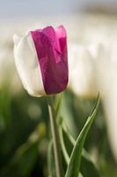 Tweekleurige tulp tussen een veld met alleen maar witte tulpen. Geen photoshop!