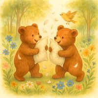 Twee schattige beren, de grootste dieren van het bos, spelen een vrolijk kussengevecht. Deze illustratie is speciaal voor een tweeling en symboliseert de unieke band tussen twee kinderen: samen spelen, lachen en ontdekken. Met zachte kleuren, bloemen en een speelse sfeer past dit kunstwerk perfect in de baby- en kinderkamer.