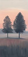 'Tweeling in de Schemering' biedt een rustgevend beeld van twee naaldbomen die opgaan in het zachte, diffuse licht van de vallende avond. De reflectie op het water voegt een dromerige kwaliteit toe, terwijl het subtiele kleurenpalet van de schemerlucht een gevoel van vredige isolatie en rust uitnodigt. Dit kunstwerk belichaamt de stille…