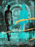 Deze monotype is gemaakt met een gelliplate. Een uniek en eenmalig werk, er kan maar 1 afdruk worden gemaakt van je ontwerp. Door de druktechniek en het gebruikte papier ontstaan er allerlei structuren en effecten. Abstract werk in turquoise, zwart, wit en goud. Twee vrouwen in spiegelbeeld, het sterrenbeeld tweeling.