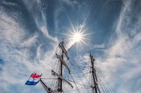 Historisch zelschip, een tweemaster voor anker, en de zon in tegenlicht als een sterretje in het beeld.