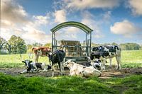 Tijdens een wandeling in het mooie Twentse landschap kwamen we langs dit weiland waar de koeien / kalveren met voldoende hooi in de schaduw lagen. De prachtige wolkenlucht maakte het plaatje compleet. Mooi land Twente.