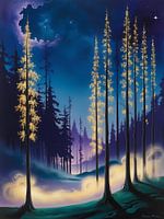 Dit fascinerende digitale schilderij toont een serene bosscène in de schemering, waar torenhoge altijd groene bomen als stille schildwachten staan tegen een achtergrond van een diepblauwe, met sterren bezaaide hemel. De bomen worden gedeeltelijk verlicht met een zacht, gouden licht, waardoor een magisch contrast ontstaat met het schaduwrijke bosinterieur. Een mistige, etherische gloed dwarrelt aan de voet van de bomen en draagt bij aan de betoverende en dromerige sfeer. De handtekening van de kunstenaar's is zichtbaar in de rechterbenedenhoek, wat duidt op een persoonlijk tintje aan dit mystieke landschap.