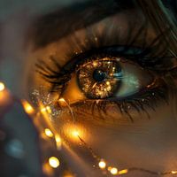 Deze fascinerende foto van een vrouwenoog trekt de kijker mee in een wereld vol magie en licht. Het oog is omgeven door fonkelende lichtsnoeren die als sterren schitteren en de intensiteit van de blik versterken. De reflecterende lichtjes in het oog creëren een betoverend effect dat de diepte en schoonheid van het moment vastlegt. Ideaal voor kunstliefhebbers die houden van unieke en indrukwekkende fotografie.