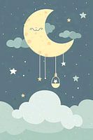 Dit kunstwerk is een illustratie van een glimlachende maan en een heldere sterrenhemel, perfect om de baby te laten glimlachen en zich veilig te voelen in de nacht. Het kan een perfecte aanvulling zijn op de muur van de babykamer, en kan zelfs helpen om de kleintjes te kalmeren en te laten inslapen.