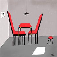 2 rode stoelen en een krukje in een kleine wachtkamer. Het licht valt via een raampje van rechts buiten het schilderij naar binnen op de vloer. Een afbeelding van een “koppoter” aan de muur. Een zwart lampje hangt vanuit het plafond boven de tafel.