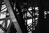 Gedetailleerde close-up van de ijzeren liggers van de beroemde Tyne Bridge en de ingewikkelde schaduwen op de kalkstenen muur in Newcastle. Foto: Tony Taylor