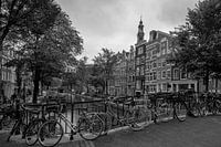 Fietsen tegen de brugleuning geparkeerd, grachtenpanden en de Westerkerktoren in één beeld gevangen, dus typisch Amsterdams!
