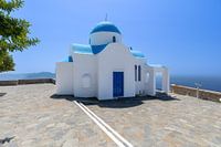 Blauw-witte kerk boven de zee, de Profeet Elias Kerk boven het bergdorp Nikia op het vulkanische eiland Nisyros in Griekenland