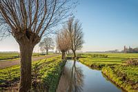 Nederlands poldergebied aan het begin van de winter. De foto is gemaakt bij Noordeloos, gemeente Molenlanden in de Alblasserwaard, provincie Zuid-Holland. Het is een koude, maar zonnige ochtend. De wilgenbomen zijn kaal en op het gladde wateroppervlak van de sloot ligt een dun ijslaagje.
