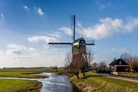 Wipwatermolen 'De Bachtenaar' te Vlist, Zuid-Holland. Deze molen staat prachtig vrij in het landschap en kijkt erg ver uit over de polder. Ook is het opvoeren van het water uit de laaggelegen polder naar het hoger gelegen boezemwater goed te zien in deze foto.
