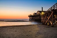 De zon is ondergegaan, de lucht en de Waddenzee schijnen in prachtige warme kleuren. Aan de horizon trekt een krabknipper zijn netten uit.