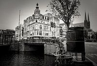 Zwartwit foto van Amsterdam, centrum met grachten, Leidsestraat en heren urinoir.