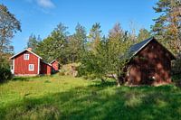 Typisch zweeds huis in het falurood met een schuur en een blauwe lucht gemaakt in de herfst