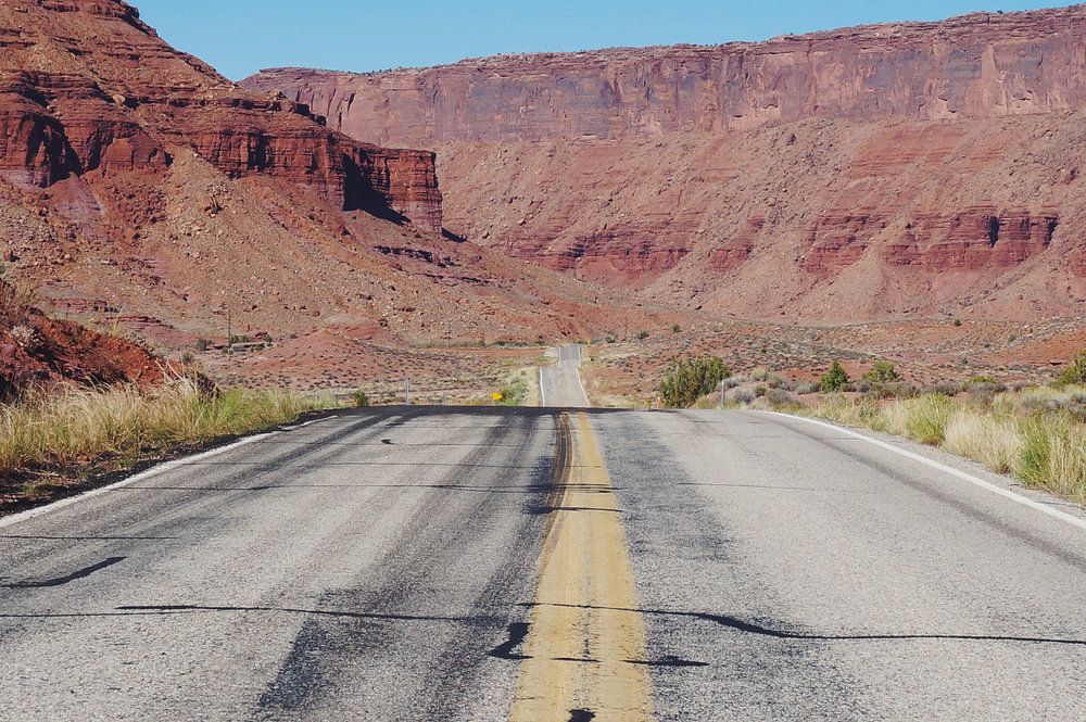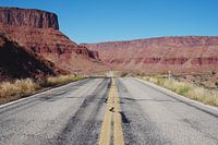 De weg naar Moab in Utah met een adembenemend canyon en rood berglandschap op de achtergrond. In deze omgeving liggen vele mooie nationale parken, zoals Canyonlands National Park en Arches National Park.