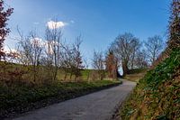 Typische holle weg in het Heuveland in het voorjaar in Mechelen, Limburg. De natuurlijke combinatie van heuvels met de groene weilanden en de mooie blauwe luchten met wolken brengt een heerlijk gevoel van vakantie in het buitenland en positiviteit