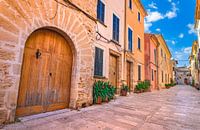 Typische straat met potplanten in Alcudia oude stad, Mallorca, Spanje, Balearen