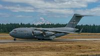 Deze foto is gemaakt tijdens een bezoek aan McChord Air Force Base op 6 augustus 2024. In de achtergrond zie je de stratovulkaan Mount Rainier.