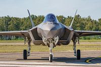 Een U.S. Air Force Lockheed Martin F-35 Lighting II komt voorbij getaxied na afloop van een vliegdemonstratie.