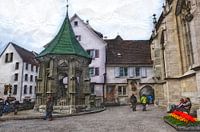 Kirchplatz vorm Überlinger Münster als Buntstiftzeichnung