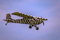 Deze foto toont een eenmotorig vliegtuig met een opvallend zebrapatroon op de vleugels en de romp. Het vliegtuig, met registratie D-MZEB, vliegt tegen een lichtblauwe lucht. Het is een klein propellervliegtuig.