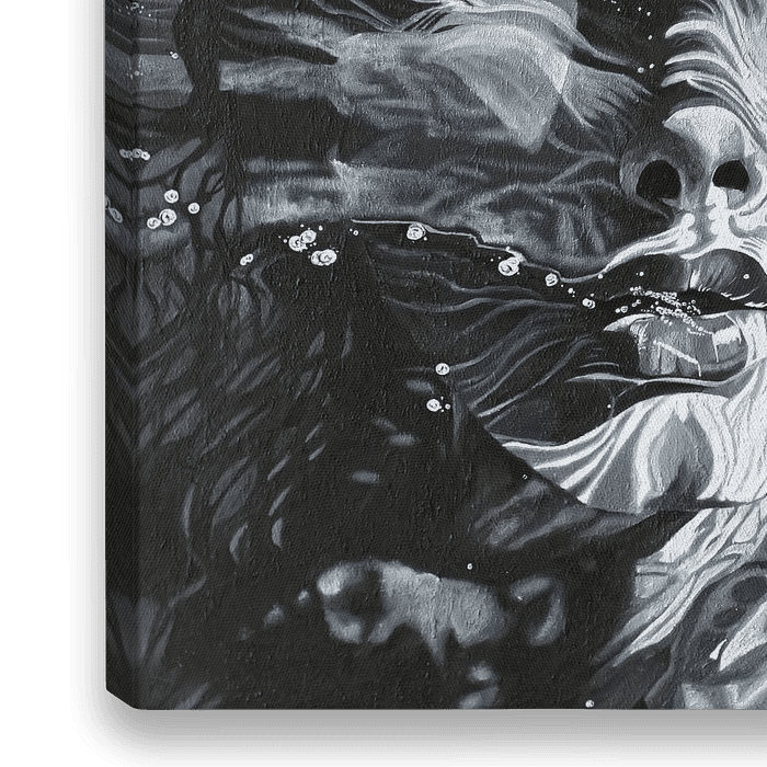 Op dit zwart-wit schilderij wordt een vrouw onder water afgebeeld. De monochromatische tinten roepen een gevoel van eenvoud op. De vrouwenfiguur zweeft sierlijk in de diepte, omringd door de vloeibaarheid van het water. Haar haar golft om haar heen, gevangen in de zachte stroming.