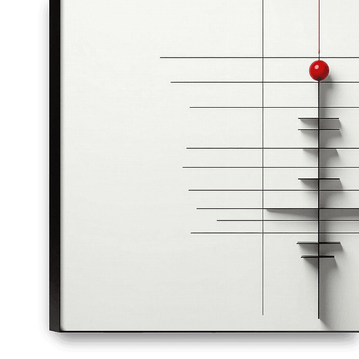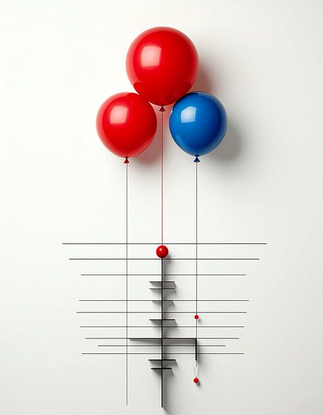 Abstracte grafische compositie die, door de aanwezigheid van rode en blauwe ballonnen, doet denken aan'élevant au dessus de fines lignes horizontales, l'importance de se dégager par le haut de différentes contraintes matérielles. C'est une oeuvre entièrement réalisée avec l'aide de l'IA die gemakkelijk zijn…
