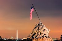 Zonsopgang bij het US Marine Corps War Memorial, ook bekend als het Iwo-Jima Memorial. Gevestigd in Arlington, Virginia, Verenigde Staten.
