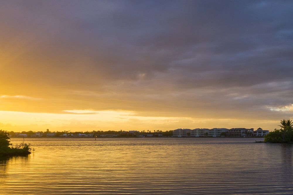USA, Florida, Gouden zonsondergang met prachtige reflecties op water en brug en huizen erachter