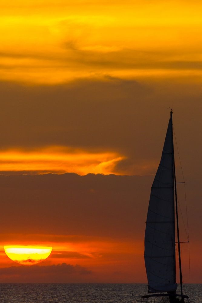 USA, Florida, Verbazingwekkende oranje zonsondergang met zeilboot op oceaanwater
