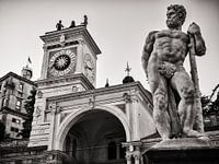 Eine Schwarzweiss-Impression aus der norditalienischen Stadt Udine: Die Piazza della Libertà mit dem Torre dell’Orologio und der Statue des Herkules.