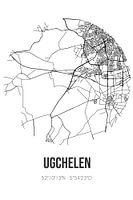 Zwart-witte landkaart, stratenplan of plattegrond van Ugchelen. Ugchelen is gelegen op de Veluwe, in de gemeente Apeldoorn, provincie Gelderland. Op de stadskaart zijn alle openbare wegen in Ugchelen opgenomen. Verder is de kaart voorzien van de coördinaten van het centrum van Ugchelen.