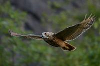 Uhu ( Bubo bubo ), Eule in lautlosem Flug entlang der Felswand eines Steinbruches, wildlife, Deutschland