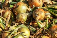 Uien op het veld liggen te drogen na het oogsten