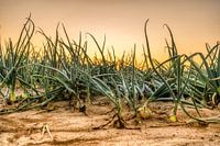Voor dag en dauw, uienveld bedekt met dauw vlak voor de zon opkomt in Simpelveld Zuid-Limburg